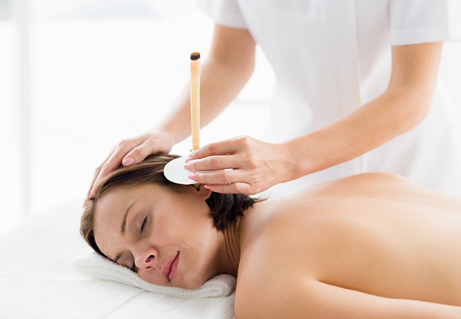 【耳燭】使用中空的特定蠟燭,利用另一端熱氣拉引耳朵內濕氣,幫助減輕頭內壓力,也有機會提升呼吸順暢度,進一步感到紓壓
